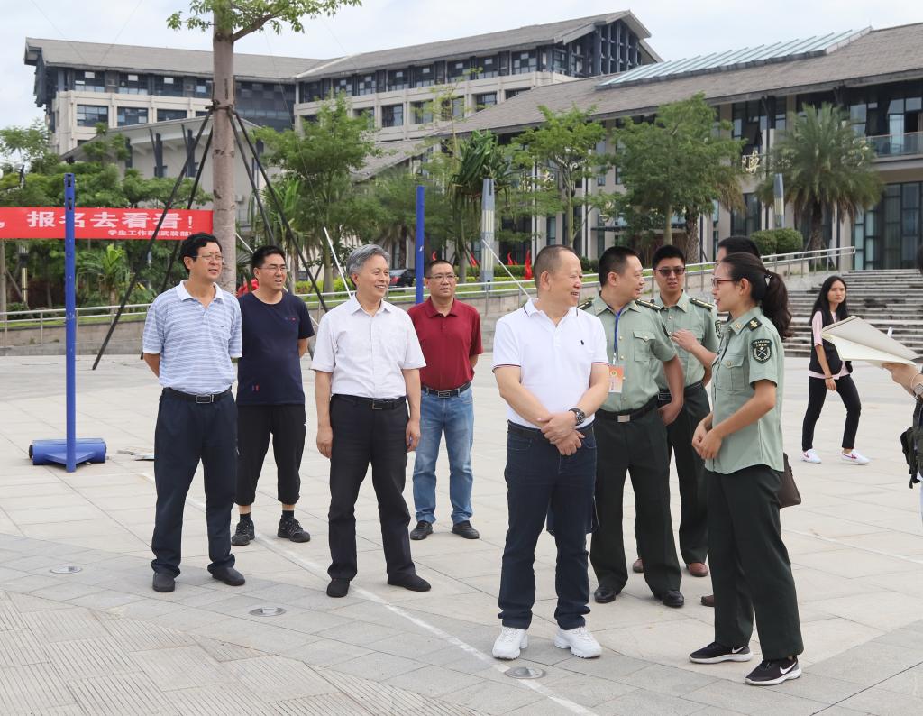 校领导一行先后检查了南苑、西苑、东苑三个校区近期开展的军训工作。看望慰问了承训的教官和参训的师生,观看了新生的训练,并送上了中秋的祝福。详细了解了今年参训学生的身体状况,关切询问了生病同学的情况,并与他们亲切交流了学习、生活上的问题,嘱咐他们要注意身体,不要勉强。同时,嘱咐工作人员和志愿者要做好后勤保障工作,确保军训工作顺利开展。