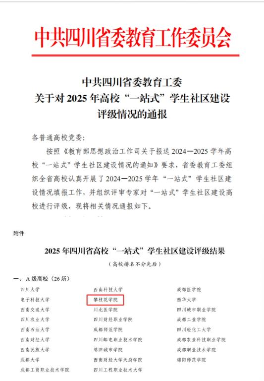 10月28日,中共四川省委教育工委通报2025年高校“一站式”学生社区建设评级结果,我校成功获评A级,跻身全省139所参评高校前15%的优质行列,标志着社区建设正式从“达标”迈向“内涵提质”新阶段。
