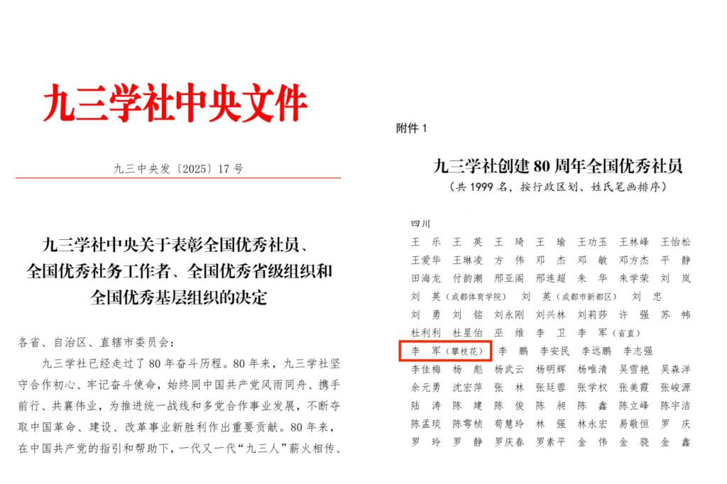 近日,九三学社中央办公厅印发《九三学社中央关于表彰全国优秀社员、全国优秀社务工作者、全国优秀省级组织和全国优秀基层组织的决定》,我校九三学社社员李军博士凭借在社务工作、教学科研、参政议政等领域的突出表现,被九三学社中央表彰为“九三学社创建80周年全国优秀社员”。