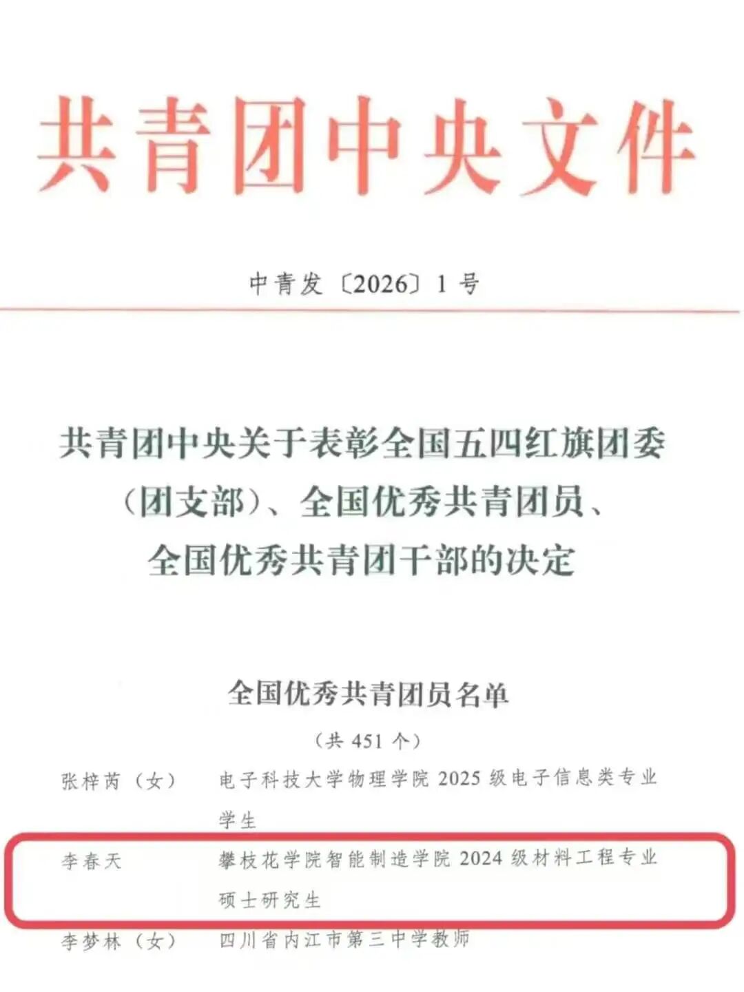 近日,共青团中央公布《关于表彰全国五四红旗团委(团支部)、全国优秀共青团员、全国优秀共青团干部的决定》,我校智能制造学院2024级材料工程专业硕士研究生李春天同学荣获“全国优秀共青团员”称号。作为共青团系统授予团员个人的最高荣誉,四川省共有27名团员获评,李春天同学与西南石油大学、电子科技大学的学生一同获评。