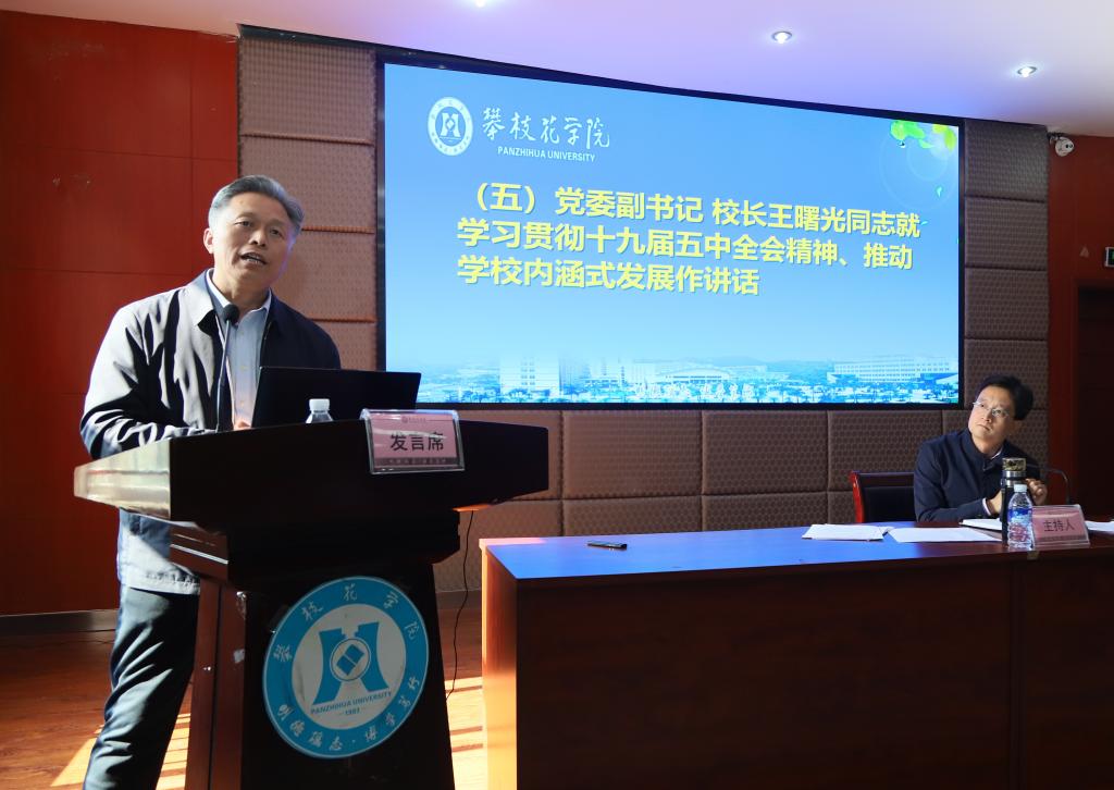 经济与管理学院副院长李博就学习解读十九届五中全会精神作专题讲座。讲座从“三个板块”“三新”“三个战略”等方面对“十四五”规划做了解读,就学校高质量发展如何依托资源优势、产业优势和积极主动融入地方发展战略等方面进行了探讨。