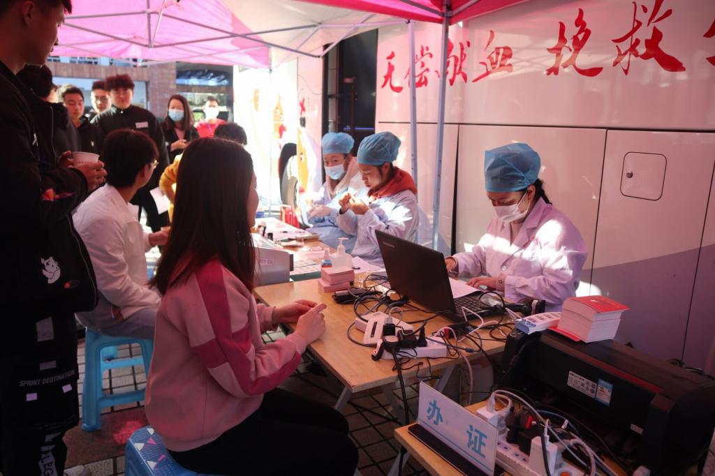市中心血站的医生在现场给师生们进行献血前的指导,并严格按照程序对献血者检测血样、进行采血。志愿者们协助现场秩序的维护工作。