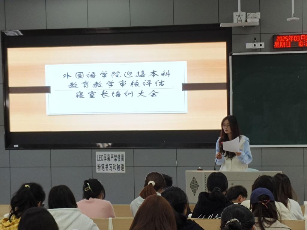 为深入贯彻落实学校本科教育教学审核评估工作要求,进一步提升学院学生社区管理水平,营造优良学风和育人环境,3月9日,外国语学院在志学楼1-101隆重召开外国语学院迎接本科教育教学审核评估寝室长培训大会。学院党委副书记张健,自律部、办公室负责人及全体寝室长参加会议。