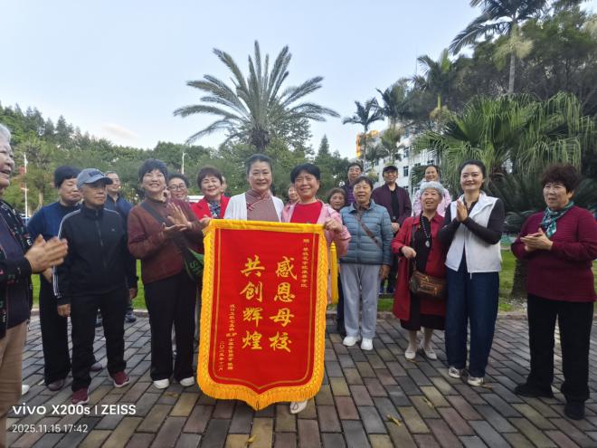 怀着深深的感恩之情,校友代表向基础医学院和康养学院赠送了一面写有“感恩母校 共创辉煌”的锦旗。那烫金的字样,不仅凝聚着校友对母校医学教育的高度认可,更承载着他们对后辈传承医道、勇担使命的殷切期望,传递出跨越半世纪的师生情谊与专业传承。